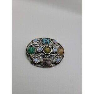Vintage Miracle Scottish Celtic Brooch Faux Agate Opal Glass Stones Silver tone