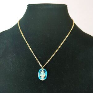 Vintage Miraculous Mary Blue Faceted Pendant With Gold-Tone Chain Necklace 19in
