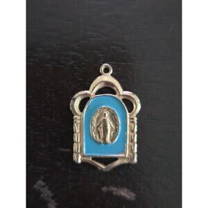 Vintage Miraculous Medal Virgin Mary Blue Enamel Gold Tone Catholic Pendant