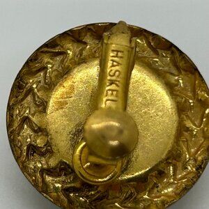 These vintage Miriam Haskell earrings feature a timeless design with intricate gold-tone detailing and speckled cabochons. A collectible beauty from a renowned jeweler.