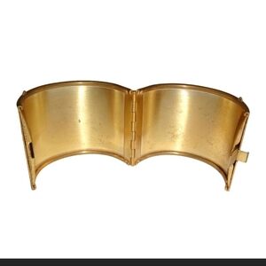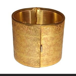 Signed Miriam Haskell SUPER CLEAN gold tone flower etched wide hinged bracelet with safety chain. Measures 2.25" diameter...7.75" circumference.....2" 1940's era
