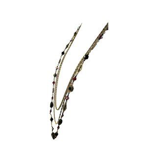 This necklace is a triple layer necklace that combines gold tone with intricate bead work that Miriam Haskell is known for. Throughout the necklace there are several stones that are possibly garnet. Stones have not been appraised.