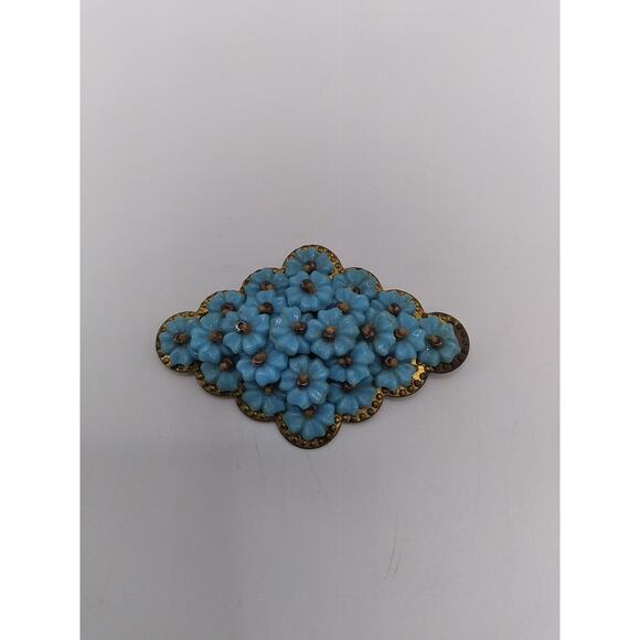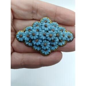 Miriam Hasjell Vintage Light Blue Glass Flower Brooch Gold Tone Beaded. 2 inch long. Great condition. Does have a little patina starting on the metal. Please ask questions if you have them and please see photos as they are part of the description. Thank you for looking and please check out my other items up for sale. Please consider saving me as a seller to see new items listed daily 😊. I25Sa123