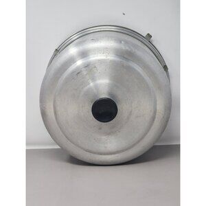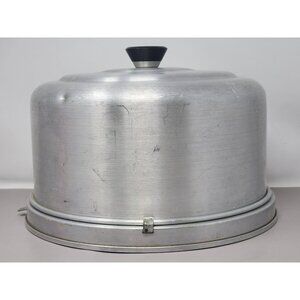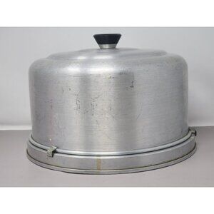 Designed to store and transport cakes securely, this vintage aluminum cake carrier combines functionality with a classic aesthetic. The black knob handle adds ease of portability.
