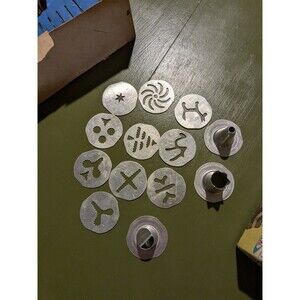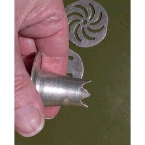 Mirro Copper and Aluminum classic cookie press and pastry filler / decorator . It's in excellent condition with 9 discs and 3 tips . ( Rosette tip is large and has a flared appearance?)