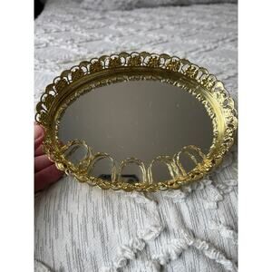 Vintage Oval Mirror Vanity Tray, Perfume, Gold Tone Filigree