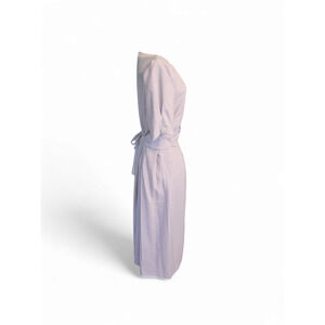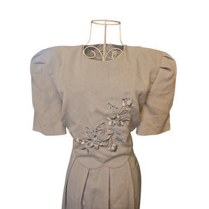 Blue and White A-line dress with a front pleated skirt and back zipper. The waist is defined by a band that ties in the back. The top has pleated sleeves and an embroidered floral pattern. Shoulder pads.