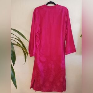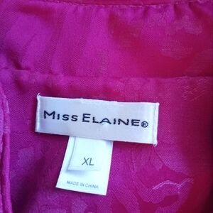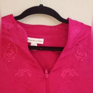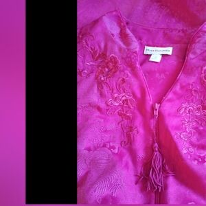 Vintage Miss Elaine Magenta Asian Inspired Floral Brocade Style V-Neck Zipper with Tassel Housedress, Oversized, Loose Fitting, Cotton Blend, Classic, Comfy, Casual, Vintage