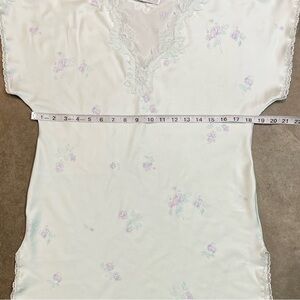 Vintage Miss Elaine nightgown made in the USA. Silky-feel fabric with delicate light blue floral print. Features lace trim along the v-neckline, sleeves, and hem. Pullover style with a relaxed, feminine fit.