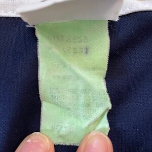 Vintage Miss Oops California navy dress with white trim. Front shoulder has gathering. Has 5 white buttons down the left side. Buttons are functioning so can be opened up for higher slit. Comes with white tie belt. Waist has elastic. Tag is very faded so hard read size but measures like size small. Please refer to measurements provided as vintage sizing differs from current sizing, to ensure an accurate fit.