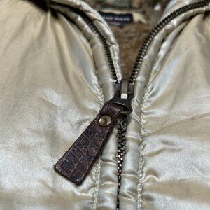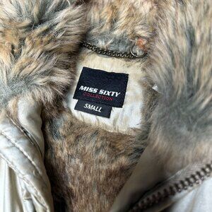 Y2K gold metallic Miss Sixty jacket with faux fur hood and cropped fit. Super warm with a soft inner lining and ribbed cuffs/hem. Features a chunky zipper with a leather pull and detailed stitching throughout. Unique shine and cozy feel โ perfect for layering or a statement streetwear look.