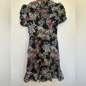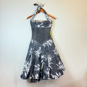 This Vintage Y2K elegant sundress by Miss Sixty features a striking black and red floral print, perfect for a wedding guest or cocktail occasion. The dress showcases a flattering wrap style with a V-neckline and short puff sleeves, adding a touch of vintage charm. Ruffle details at the hem complete the romantic and feminine look.