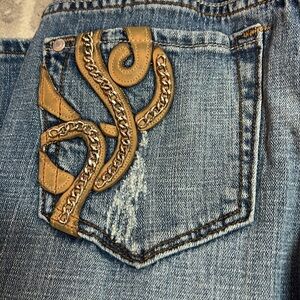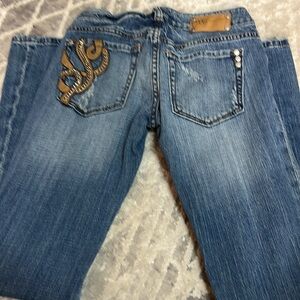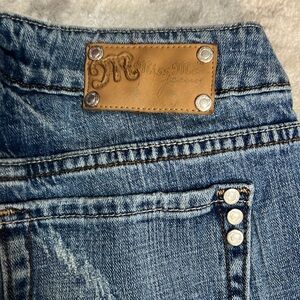These jeans are old school vintage. Miss me. These were not overdone very simple with just leather and a little chain on the front and back pocket. Still has all the original silver buttons.