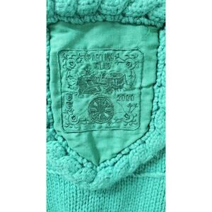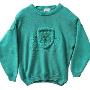 Deep aqua green. Unique embroidered linen design on front trimmed in the same sweater material