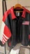 Stylish black and red faux leather jacket featuring an American flag patch. Perfect for a bold, patriotic look. Men’s XXLT. Please note the multiple areas of discoloration/mild stains on the white material and the cracking along the collar on the back.