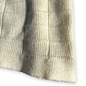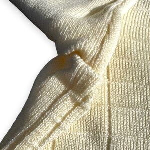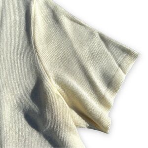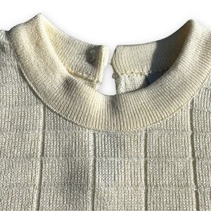 Vintage 80s/90s pale yellow short sleeve knit sweater with a windowpane design across the front and a solid back and contrast hems. Soft yet still cozy top with a keyhole design at the top back and button collar closure. Slight stretch.