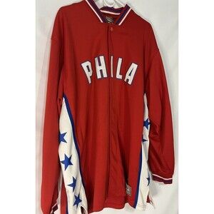 Vintage Mitchell & Ness Philadelphia 76ers Allen Iverson Warm Up Jacket in XL size. This iconic Hardwood Classics piece showcases the legendary Allen Iverson's legacy with the 76ers. The jacket is in good condition, preserving its nostalgic appeal. A must-have for basketball and Iverson fans alike.