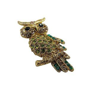 Vintage Mixed Rhinestones Emerald Peridot Owl on a Branch Brooch Gold Tone 2x1". Brand: Unbranded/Not marked. Type: Brooch. Main Stone Color: Clear, Emerald Onyx and Peridot. Material: Crystal Rhinestones. Metal: Gold Plated/Gold Tone. Department: Women. Base Metal: Gold Plated. Jewelry Department: Fashion. Signed: No. Vintage: Yes. Condition: Preowned in good condition. All stones are in tact none missing. No markings or signature. Fashion brooch – gold tone. May need a slight cleaning when you receive - I will let new buyer do this as I am not an expert in cleaning vintage pieces and some are allergic to cleaning products. Smoke free and Pet free home.