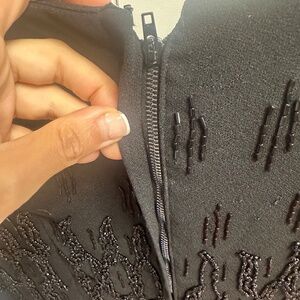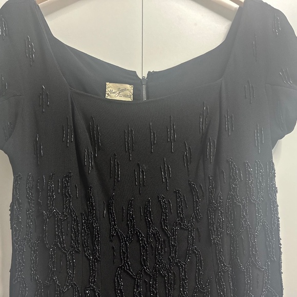 Elegant vintage black beaded cocktail dress by Mme Zena, a boutique label once based on Geary Street, San Francisco. This stunning piece features intricate hand-sewn black beadwork that catches the light beautifully, giving a timeless, sophisticated shimmer. The silhouette is fitted and knee-length with short sleeves and a graceful scoop neckline, perfect for formal occasions or elegant evening wear.