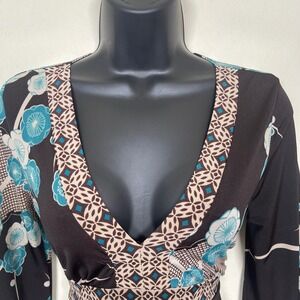 Keywords: Moa Moa, Womens top, Floral print top, Kimono sleeve top, V neck top, Blouse, Medium, Black top, Blue floral, Bohemian, Retro, Made in USA, Floral blouse, Patterned top