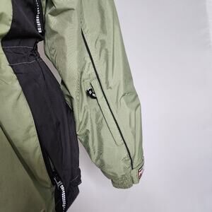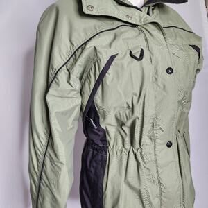 Vintage green and black 2 piece ski jacket from Mobius. Outer jacket is water resistant with drawstring waist and hem. Fleece jacket zips into the outer jacket and also has a drawstring waist. Both can be worn alone.
