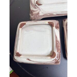 Elegant vintage mocha swirl ceramic ashtray set with unique brown and cream swirled patterns. Adds a sophisticated touch to any decor.