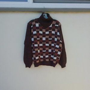 Unique vintage brown wool blend sweater with checkered or basket weave -esque patchwork of brown, tan, white front pattern. Some of the rectangles are raised. Mock neck. Long sleeves. GVC.