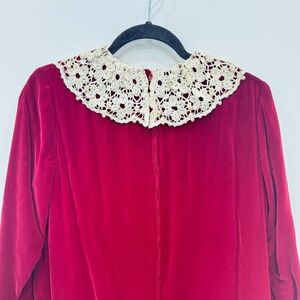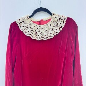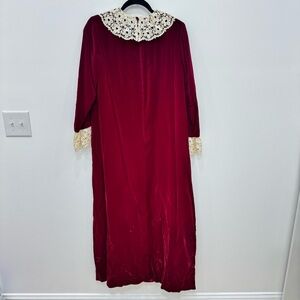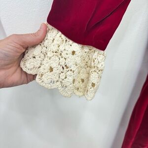Vintage Mod 60’s Collectors piece dress Rare Saks Fifth Avenue Red Velvet Maxi Dress featuring a lace pearl collar and sleeve details a Talon zipper with a lined taffeta inlay