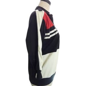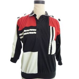 Cute lightweight mod top with 3/4 sleeves. Cloth covered buttons and button appliques on shoulder. Good used condition with some wear- faint stain on front white portion.