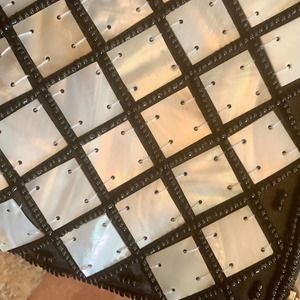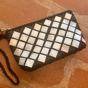 Hand Made in Vietnam. Beautiful bead work. The bag is made of 90% Spun Silk and 10% Natural Horn. Although it looks like it would be Mother of Pearl, those squares appear to be made of what I would assume to be buffalo horn. An absolutely beautiful bag!