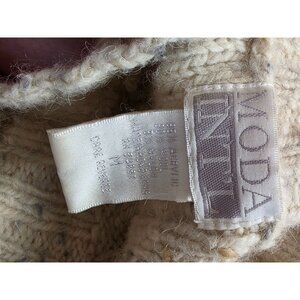 This vintage sweater from Moda International is crafted with a classic cable knit pattern. Its neutral tones make it versatile for various outfits. With a cozy design, it is suitable for cooler seasons, providing warmth and style.