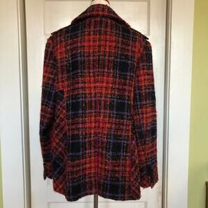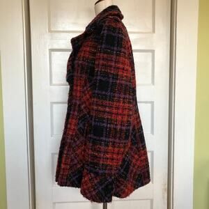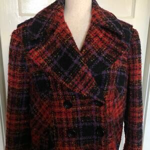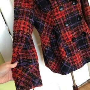 😍 Bold, cozy Y2K plaid peacoat in nubby boucle—statement red and purple with a big collar.