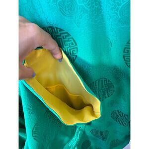 This exquisite Mode Elegante silk jacket from Peninsula Hotel Kowloon, Hong Kong is a true vintage find! Featuring a vibrant green silk fabric with intricate traditional Chinese circular patterns, this piece has an elegant mandarin collar, frog closures, and a luxurious yellow lining.
