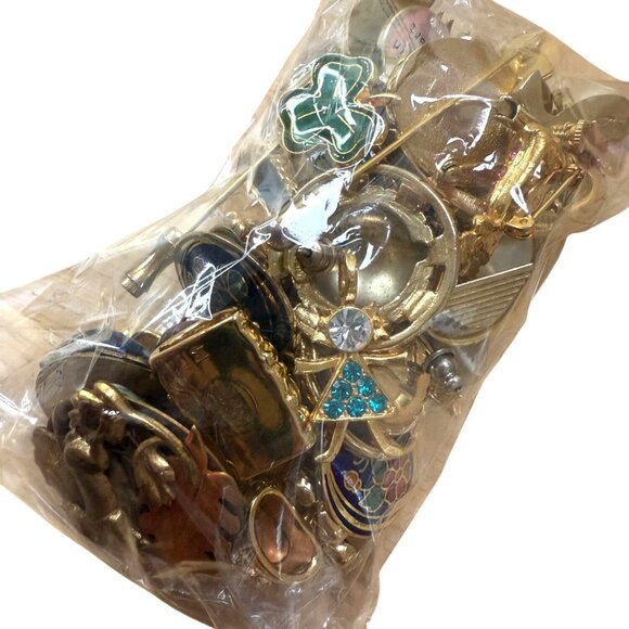 A delightful assortment of costume jewelry showcasing a variety of vintage and modern pieces. This collection includes earrings, brooches, and pins, perfect for wearing or crafting projects or upcycling. With intricate designs and golden tones, they exude a timeless charm and provide endless possibilities for creative endeavors.