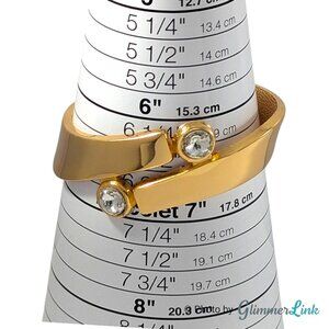 Vintage gold tone hinged cuff featuring a bold modernist design with a smooth, polished finish and sculptural, angled front. Each end is accented with a bezel-set clear rhinestone.