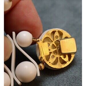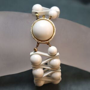 Fun vintage bracelet composed of two rows of white plastic beads alternating with white metal links that come together to form a wishbone shape. Great mod feeling! Gold tone metal slide-in clasp, unmarked, with white plastic cabochon on top. Bracelet measures 1" wide and 7 1/2" long, and its in great vintage condition -- the only thing I see is a bit of yellowed glue around the stone on the clasp, and its not terrible looking.