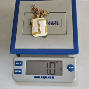 This Vintage Modernist White Enamel Gold Tone Signed Crown Trifari Pendant Necklace is a stylish piece of fashion jewelry for women. The chunky pendant features an asymmetrical geometric shape in gold tone metal and white enamel. The necklace has a 24-inch rope chain with a spring ring closure, making it easy to wear and pair with various outfits. Signed by the iconic brand Trifari, this retro-inspired necklace exudes beauty and artistry, perfect for those who appreciate vintage and antique jewelry with a modern twist. In very good pre-owned condition with little to no wear.