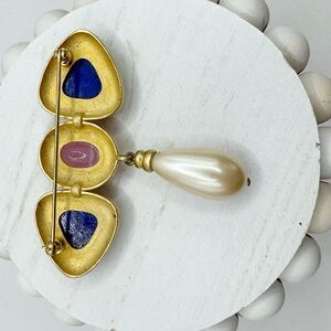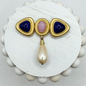 Vintage Mogul Style Pink Faux Gripoix Gold Tone Large Brooch Pin With Drop Pearl