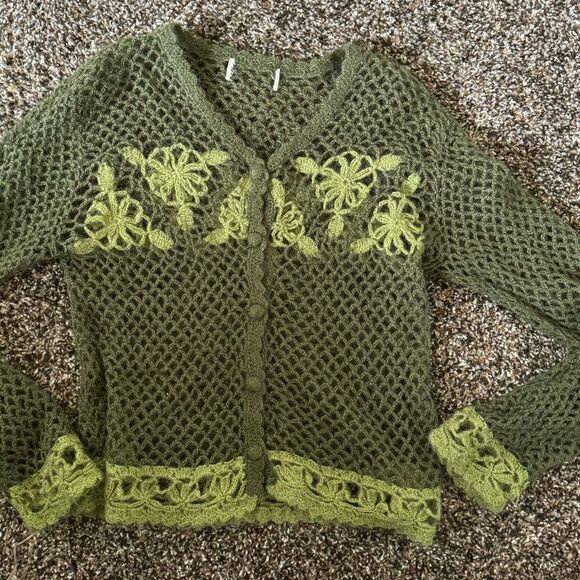 Vintage Mohair Open Crochet Cardigan Sweater Sz Small Green Floral Embroidered