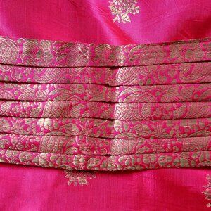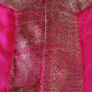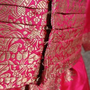 Description: Striking vintage tunic style dress by Mohan’s (Kowloon, Hong Kong) in luminous fuchsia pink with intricate gold brocade accents. Mandarin style collar, 3/4 sleeves, and an ornate matching brocade belt that cinches the waist. Gold woven motifs are scattered throughout, with richly detailed trim down the front plus cuffs and hem. Elegant, theatrical, and perfect for events, performances, festival wear, or anyone who loves a statement piece.