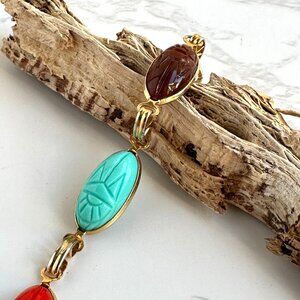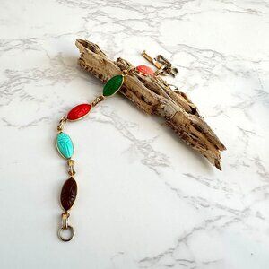 This vintage molded glass scarab bracelet features six vibrant glass stones in rich jewel tones—red, green, turquoise, brown, coral, and orange—each carved with scarab motifs and set in gold-plated bezels. Measuring 7 inches long, it secures with a fold-over clasp and safety chain for added peace of mind. It is a beautiful example of midcentury Egyptian Revival design.