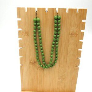 A stylish green beaded necklace featuring a double strand design, ideal for accessorizing diverse outfits with a retro touch.