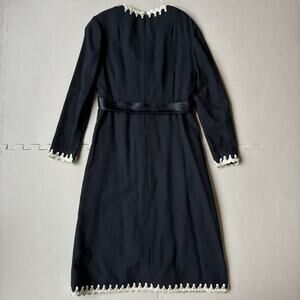 Vintage Mollie Parnis Boutique Black Wool Dress 60s Mod Cream Trim Bow Detail