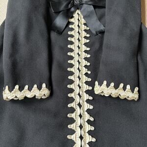 * Features: International Ladies Garment Workers Union Made in USA, zips in back with clasp, satin belt with bow detail, cream braided trim, sleek tailoring, sold at Saks Fifth Avenue
