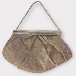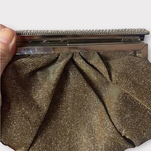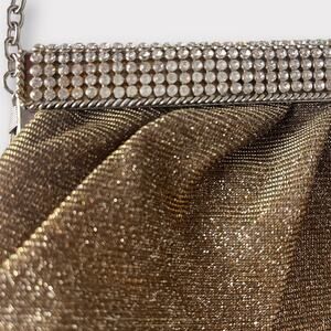 Sparkly gold fabric evening bag, clutch with rhinestone trimmed clasp and stowable chain strap. Satin lined.