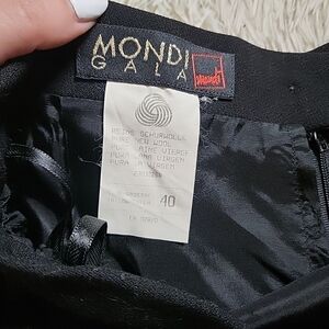 Fantastic classic high quality European black pencil skirt. Capsule wardrobe closet staple basic piece. Perfect for mobwife mob wife aesthetic and work office professional business career wear. EU 40 or US 8 or UK 12 size. Vintage tho which tends to run small so please see measurements. Lovely classic pencil skirt style with back middle slit. Back middle invisible zipper closure with top button tab closure as well. Pure new wool. Brand is designer Mondi Gala. Vintage prob from the 80s. High quality quiet luxury brand. I think this is/was a German brand. Lightly worn then stored. General age wear and looks like a large light stain on front (see pics) haven't tried to cleanit. Fair used condition; FUC. ✨️💫