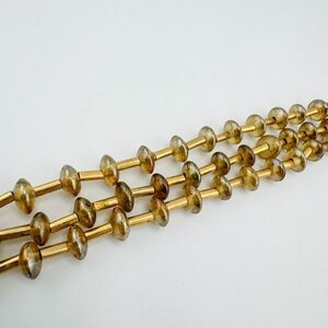 Elegant Monet bracelet! Three strands of gold-tone bars and faceted beads, a minimalist glam touch. Retro MCM design, perfect for adding subtle sparkle. Versatile and chic, this bracelet elevates any look with timeless style. A vintage treasure from a renowned maker.