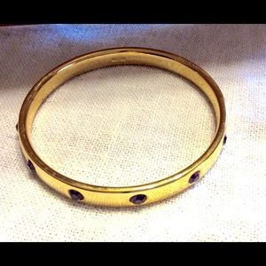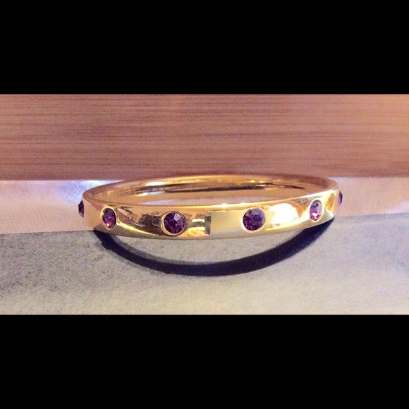 Listing is for a really pretty gold tone metal bangle bracelet encrusted with purple crystal rhinestones. Signed Monet. Measures approximately 2-3/4" across top of bracelet. Bracelet is in excellent condition please ignore the photo flash and glare