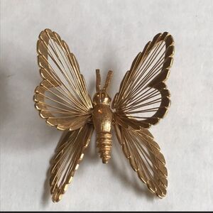 Adorn your collection with this exquisite vintage Monet butterfly brooch. Crafted with precision and elegance, the gold-tone design showcases intricate openwork wings, radiating a delicate yet regal charm. Measuring approximately 2 inches by 1 3/4 inches, the brooch's fine detailing captures the beauty of a butterfly in mid-flight, with a textured gold-tone body and delicately curved antennas adding to its lifelike appearance.