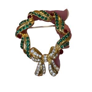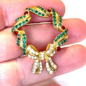 Vintage Monet Christmas brooch gold with green red white rhinestones wreath pin